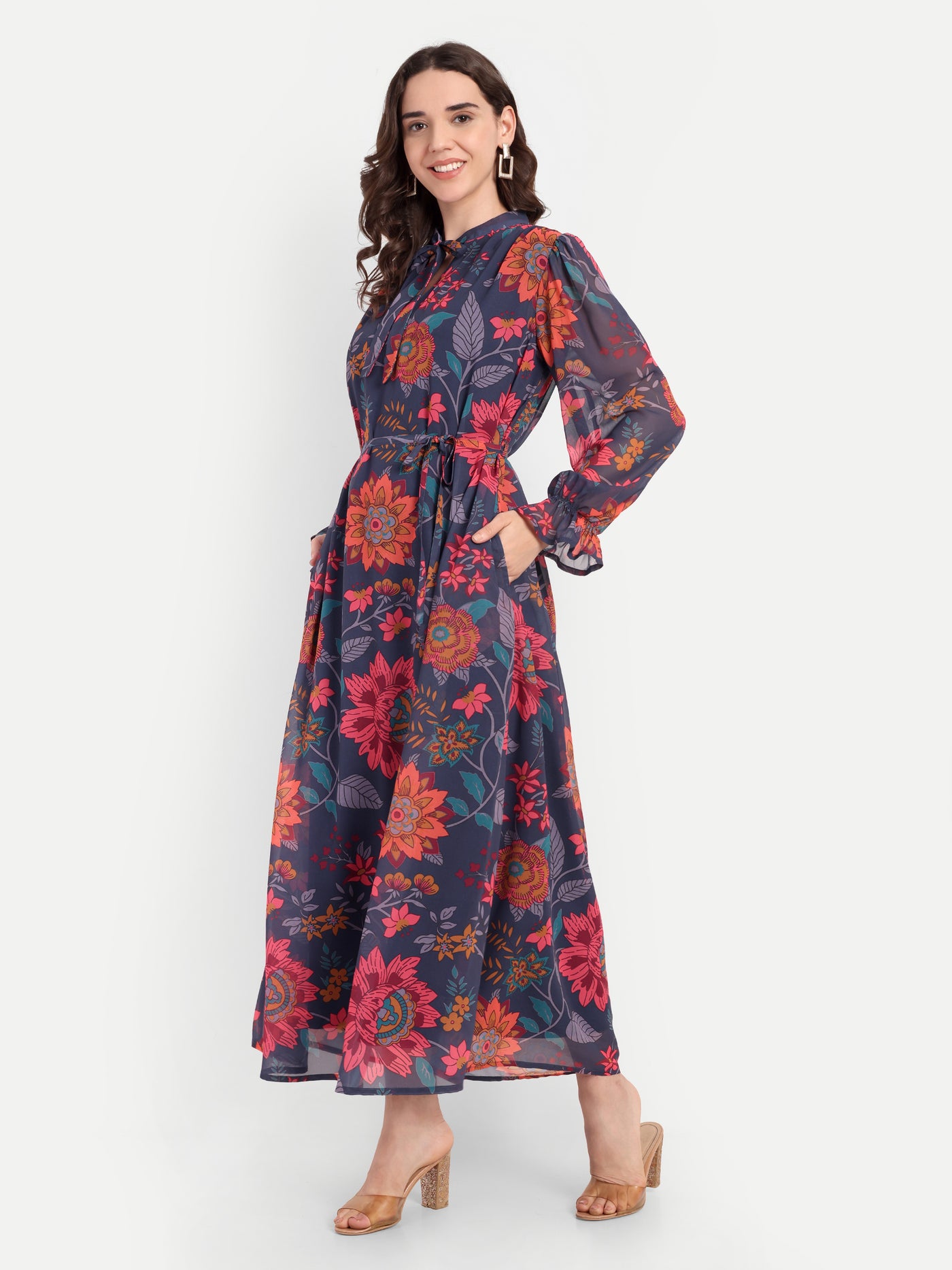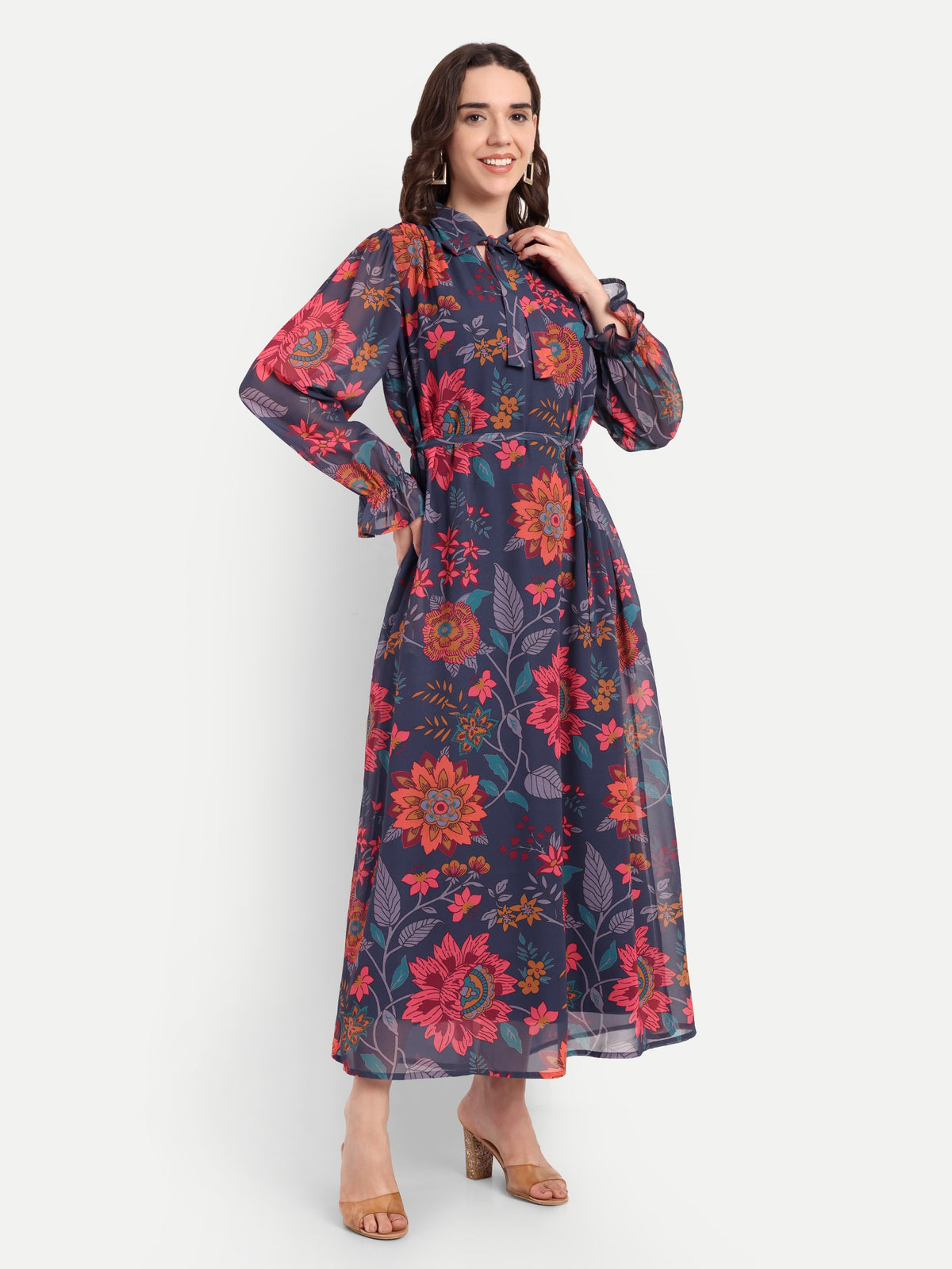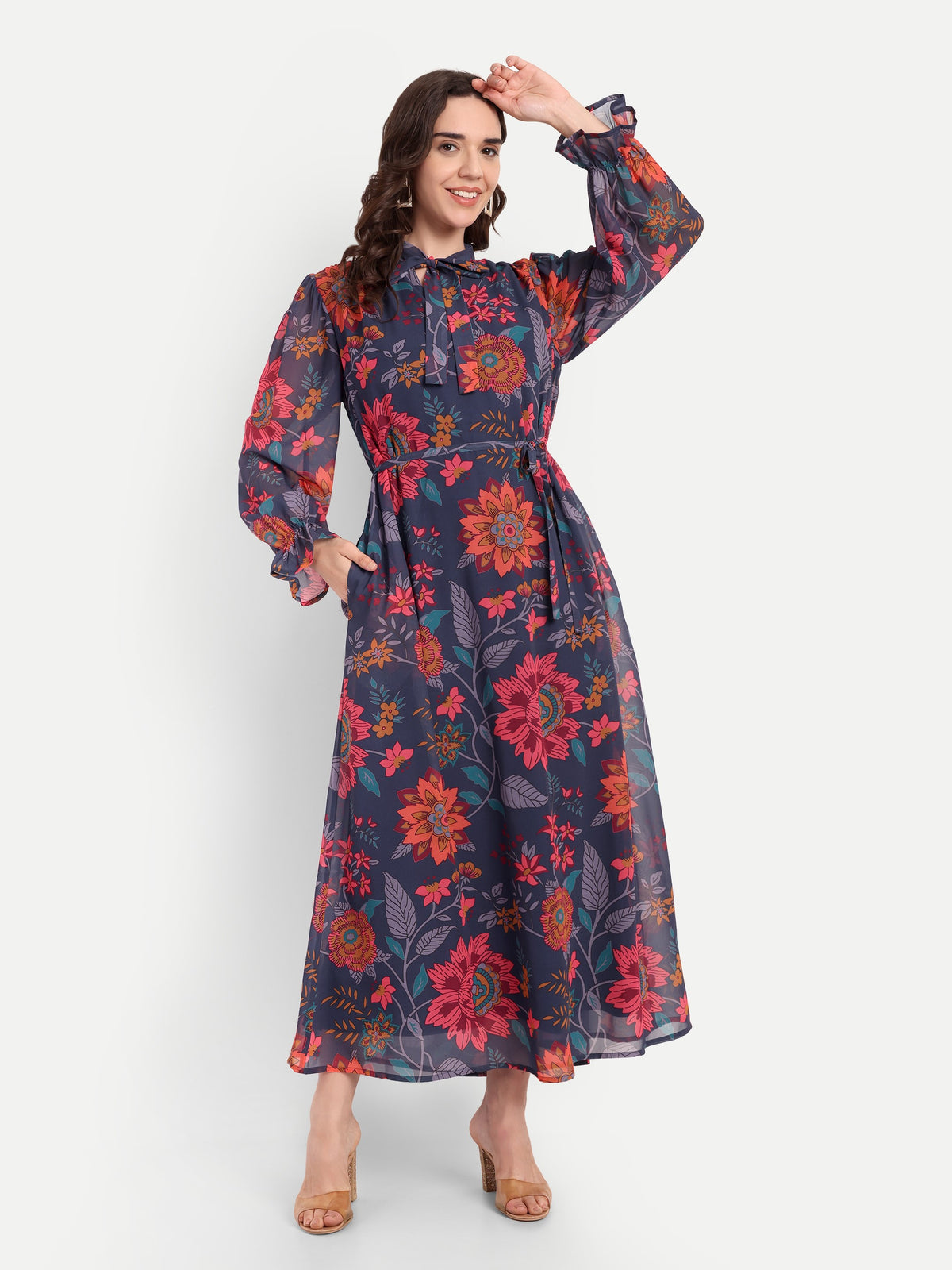 Midnight Bloom Tie-Neck Maxi Dress